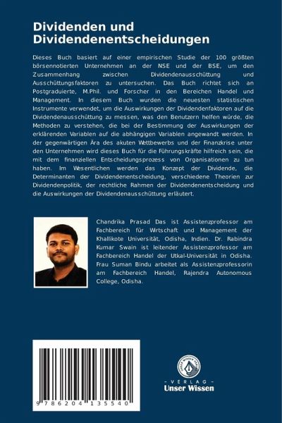 Dieses Buch basiert auf einer empirischen Studie der 100 größten börsennotierten Unternehmen an der NSE und der BSE, um den Zusammenhang zwischen Dividendenausschüttung und Ausschüttungsfaktoren zu untersuchen. Das Buch richtet sich an Postgraduierte, M.Phil. und Forscher in den Bereichen Handel und Management. In diesem Buch wurden die neuesten statistischen Instrumente verwendet, um die Auswirkungen der Dividendenfaktoren auf die Dividendenausschüttung zu messen, was den Benutzern helfen würde, die Methoden zu verstehen, die bei der Bestimmung der Auswirkungen der erklärenden Variablen auf die abhängigen Variablen angewandt werden. In der gegenwärtigen Ära des akuten Wettbewerbs und der Finanzkrise unter den Unternehmen wird dieses Buch für die Führungskräfte hilfreich sein, die mit dem finanziellen Entscheidungsprozess von Organisationen zu tun haben. Im Wesentlichen werden das Konzept der Dividende, die Determinanten der Dividendenentscheidung, verschiedene Theorien zur Dividendenpolitik, der rechtliche Rahmen der Dividendenentscheidung und die Auswirkungen der Dividendenausschüttung erläutert.