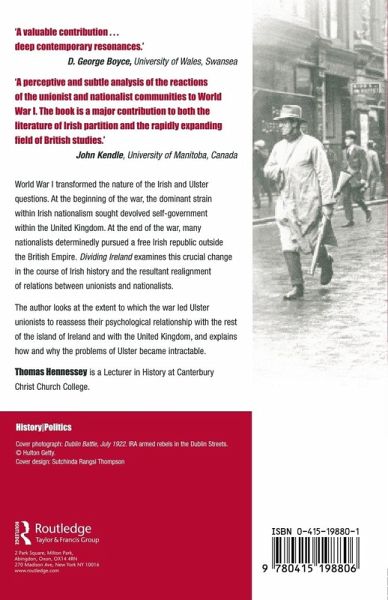 This book provides an original assessment of the First World War in Ireland and its consequences, the key to understanding the complexities of the Irish nation today. Thomas Hennessey explores how the War transformed the nature of the Irish and Ulster questions from devolved self-government within the UK to a free Irish republic outside the British Empire, considering such influential figures as de Valera and Michael Collins, and issues such as conscription. He examines both this process of re-evaluation, and the vital question of the consequences for Northern Ireland today.