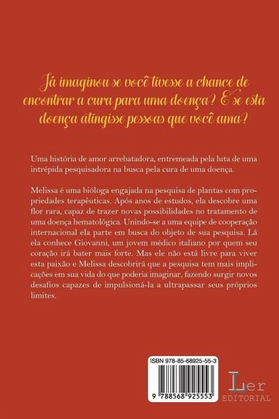 Já imaginou se você tivesse a chance de encontrar a cura para uma doença? E se esta doença atingisse pessoas que você ama? Uma história de amor arrebatadora, entremeada pela luta de uma intrépida pesquisadora na busca pela cura de uma doença. Melissa é uma bióloga engajada na pesquisa de plantas com propriedades terapêuticas. Após anos de estudos, ela descobre uma flor rara, capaz de trazer novas possibilidades no tratamento de uma doença hematológica. Unindo-se a uma equipe de cooperação internacional ela parte em busca do objeto de sua pesquisa. Lá ela conhece Giovanni, um jovem médico italiano por quem seu coração irá bater mais forte. Mas ele não está livre para viver esta paixão e Melissa descobrirá que a pesquisa tem mais implicações em sua vida do que poderia imaginar, fazendo surgir novos desafios capazes de impulsioná-la à ultrapassar seus próprios limites. Envolva-se nesta jornada na busca incessante para manter a vida.