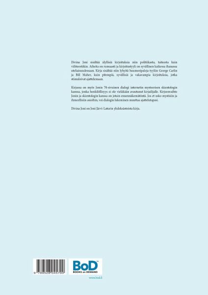 Divina Joni sisältää älyllisiä kirjoituksia niin politiikasta, taiteesta kuin viihteestäkin. Aiheita on runsaasti ja kirjoitustyyli on syvällinen kaikessa ihanassa uteliaisuudessaan. Kirja sisältää niin lyhyitä huumoripaloja tyyliin George Carlin ja Bill Maher, kuin pitempiä, syvällisiä ja vakavampia kirjoituksia, jotka stimuloivat ajattelemaan. Kirjassa on myös Jonin 70-sivuinen dialogi internetin mysteerisen skientologin kanssa, jonka henkilöllisyys ei ole vieläkään avautunut kirjailijalle. Kirjeenvaihto Jonin ja skientologin kanssa on jotain ennennäkemätöntä. Jos et usko mystisiin ja ihmeellisiin asioihin, voi dialogin lukeminen muuttaa ajattelutapasi. Divina Joni on Joni Järvi-Laturin yhdeksästoista kirja.