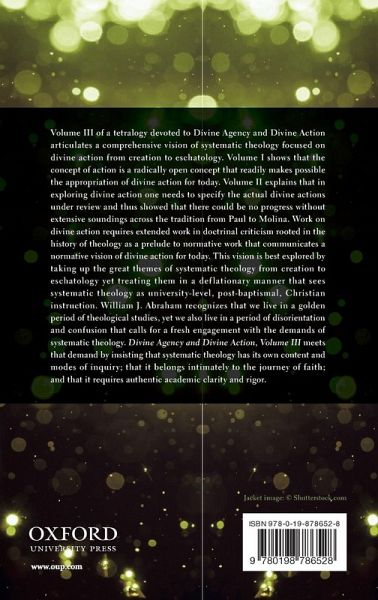 Volume III of a tetralogy devoted to Divine Agency and Divine Action articulates a comprehensive vision of systematic theology focused on divine action from creation to eschatology. Volume I developed the foundational conceptual work by showing that the concept of action is a radically open concept that readily makes possible the appropriation of divine action for today. Volume II explained that in exploring divine action one needs to specify the actual divine actions under review and thus showed that there could be no progress with extensive soundings across the tradition from Paul to Molina. Work on divine action requires extended work in doctrinal criticism rooted in the history of theology as a prelude to normative work that communicates a normative vision of divine action for today. This vision is best explored by taking up the great themes of systematic theology from creation to eschatology yet treating them in a deflationary manner that sees systematic theology as university-level, postbaptismal, Christian instruction. Leading scholar William J. Abraham recognises that we live in a golden period of theological studies-the range and depth of material is extraordinary-yet we also live in a period of disorientation and confusion that calls for a fresh engagement with the demands of systematic theology. Divine Agency and Divine Action, Volume III meets that demand by insisting that systematic theology has its own content and modes of inquiry; that it belongs intimately to the journey of faith; and that it requires authentic academic clarity and rigor. It reclaims the rightful place of systematic theology as the center of gravity for theological studies but does so in a manner that makes it available to both the church and to the academy.