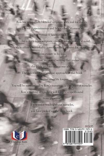 Ron has masterfully blended scripture with real life events. "Divine Appointments and Miraculous Moment's format is fascinating. Ron takes a story from scripture, crafts it into a historical novel. He then offers a remarkable corresponding present day experience from events in his life. His distinctive, animated writing flair makes the Bible and miracles come alive. The innovative and unique approach of this book will impact your life forever. You will be mesmerized by Ron's numerous testimonies of miracles. Ron's riveting storytelling will keep you spellbound from page one. If you enjoy reading about miracles, you have picked up the right book