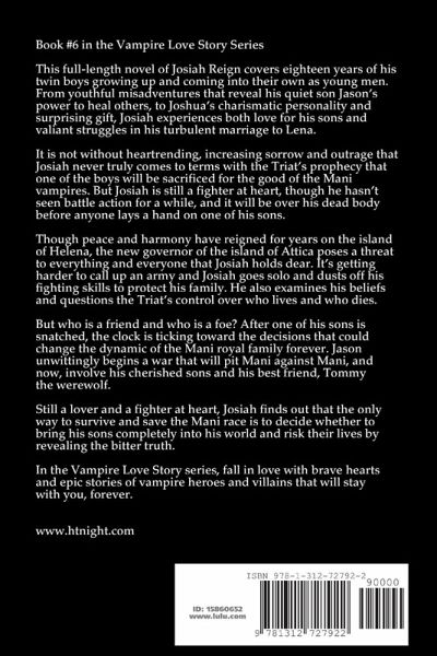 This full-length novel of Josiah Reign covers eighteen years of his twin boys growing up and coming into their own as young men. From youthful misadventures that reveal his quiet son Jason's power to heal others, to Joshua's charismatic personality and surprising gift, Josiah experiences both love for his sons and valiant struggles in his turbulent marriage to Lena. It is not without heartrending, increasing sorrow and outrage that Josiah never truly comes to terms with the Triat's prophecy that one of the boys will be sacrificed for the good of the Mani vampires. But Josiah is still a fighter at heart, though he hasn't seen battle action for a while, and it will be over his dead body before anyone lays a hand on one of his sons. It's getting harder to call up an army and Josiah goes solo and dusts off his fighting skills to protect his family. He also examines his beliefs and questions the Triat's control over who lives and who dies. But who is a friend and who is a foe?