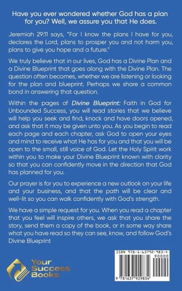 Have you ever wondered whether God has a plan for you? Well, we assure you that He does. Jeremiah 29:11 says, "For I know the plans I have for you, declares the Lord, plans to prosper you and not harm you, plans to give you hope and a future." We truly believe that in our lives, God has a Divine Plan and a Divine Blueprint that goes along with the Divine Plan. The question often becomes, whether we are listening or looking for the plan and blueprint. Perhaps we share a common bond in answering that question. Within the pages of Divine Blueprint: Faith in God for Unbounded Success, you will read stories that we believe will help you seek and find, knock and have doors opened, and ask that it may be given unto you. As you begin to read each page and each chapter, ask God to open your eyes and mind to receive what He has for you and that you will be open to the small, still voice of God. Let the Holy Spirit work within you to make your Divine Blueprint known with clarity so that you can confidently move in the direction that God has planned for you. Our prayer is for you to experience a new outlook on your life and your business, and that the path will be clear and well-lit so you can walk confidently with God's strength. We have a simple request for you. When you read a chapter that you feel will inspire others, we ask that you share the story, send them a copy of the book, or in some way share what you have read so they can see, know, and follow God's Divine Blueprint.