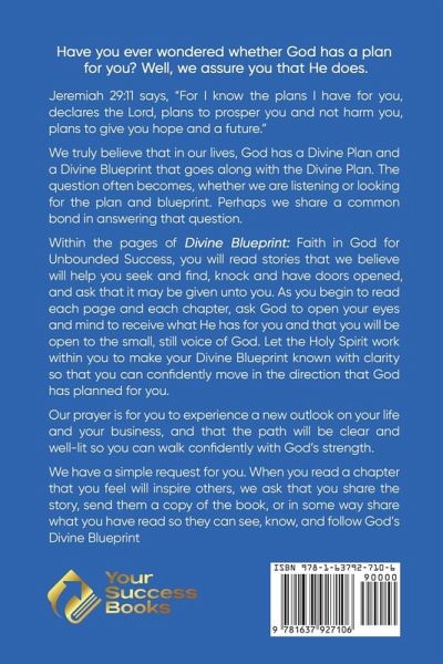 Have you ever wondered whether God has a plan for you? Well, we assure you that He does. Jeremiah 29:11 says, "For I know the plans I have for you, declares the Lord, plans to prosper you and not harm you, plans to give you hope and a future." We truly believe that in our lives, God has a Divine Plan and a Divine Blueprint that goes along with the Divine Plan. The question often becomes, whether we are listening or looking for the plan and blueprint. Perhaps we share a common bond in answering that question. Within the pages of Divine Blueprint: Faith in God for Unbounded Success, you will read stories that we believe will help you seek and find, knock and have doors opened, and ask that it may be given unto you. As you begin to read each page and each chapter, ask God to open your eyes and mind to receive what He has for you and that you will be open to the small, still voice of God. Let the Holy Spirit work within you to make your Divine Blueprint known with clarity so that you can confidently move in the direction that God has planned for you. Our prayer is for you to experience a new outlook on your life and your business, and that the path will be clear and well-lit so you can walk confidently with God's strength. We have a simple request for you. When you read a chapter that you feel will inspire others, we ask that you share the story, send them a copy of the book, or in some way share what you have read so they can see, know, and follow God's Divine Blueprint.