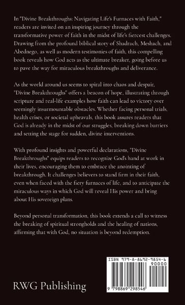 In "Divine Breakthroughs: Navigating Life's Furnaces with Faith," readers are invited on an inspiring journey through the transformative power of faith in the midst of life's fiercest challenges. Drawing from the profound biblical story of Shadrach, Meshach, and Abednego, as well as modern testimonies of faith, this compelling book reveals how God acts as the ultimate breaker, going before us to pave the way for miraculous breakthroughs and deliverance. As the world around us seems to spiral into chaos and despair, "Divine Breakthroughs" offers a beacon of hope, illustrating through scripture and real-life examples how faith can lead to victory over seemingly insurmountable obstacles. Whether facing personal trials, health crises, or societal upheavals, this book assures readers that God is already in the midst of our struggles, breaking down barriers and setting the stage for sudden, divine interventions. With profound insights and powerful declarations, "Divine Breakthroughs" equips readers to recognize God's hand at work in their lives, encouraging them to embrace the anointing of breakthrough. It challenges believers to stand firm in their faith, even when faced with the fiery furnaces of life, and to anticipate the miraculous ways in which God will reveal His power and bring about His sovereign plans. Beyond personal transformation, this book extends a call to witness the breaking of spiritual strongholds and the healing of nations, affirming that with God, no situation is beyond redemption. "Divine Breakthroughs: Navigating Life's Furnaces with Faith" is not just a book-it's a declaration of victory, an anthem of hope for anyone longing to experience the overwhelming power of God in their lives and in the world.
