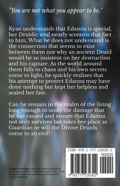 He is not what he appears to be. He's willing to face anything just to stay with her, even a torturous afterlife. Kyan understands that Edanna is special, her Druidic soul nearly screams that fact to him. What he does not understand is the connection that seems to exist between them nor why an ancient Druid would be so insistent on her death. As the world around them falls to chaos and his own secrets come to light, he quickly realizes that his attempt to protect Edanna has done nothing but keep her helpless. His actions may have sealed her fate. Trigger warnings: This book contains abduction, blood, bones, captivity, childbirth, corpses, cults, death, mental illness, murder, pregnancy, sexual assault, suicide, and torture.