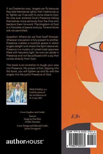 If, as Chesterton says, 'angels can fly because they take themselves lightly,' then it behooves us to 'lighten up' if we wish to come close to God. No one ever entered God's Presence taking themselves more seriously than the One who beckons them forward. The kingdom of God is a Paradise of peace and joy. Funeral faces are not permitted. Question: Where do we find God? Answer: Wherever one person is fully present to another. Presence creates a mystical space in which angels delight and where the Spirit descends. Presence is a mystery of unrestricted openness filled with heavenly light. No one can abide in Presence and not be suffused with a joy that comes directly from God. This book is an invitation to laugh your way into Presence. My prayer is that, dipping into this book, you will lighten up and fly with the angels into the joyful Presence of God.