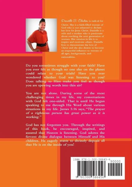 Do you sometimes struggle with your faith? Have you ever felt as though no one else on the planet could relate to your trials? Have you ever wondered whether God was listening to you? Does talking to Him make you feel as though you are spewing words into thin air? You are not alone. During some of the most challenging times in my life, my conversations with God felt one-sided. That is until He began speaking to me through His Word about various situations in my life. James 5:16 says,"The prayer of a righteous person has great power as it is working." God has not forgotten you. Through the writings of this book, be encouraged, inspired, and assured that Heaven is listening. God adores the fervent divine dialogue between Himself and His children. He eagerly wants to divinely deposit all that He is on the inside of you!