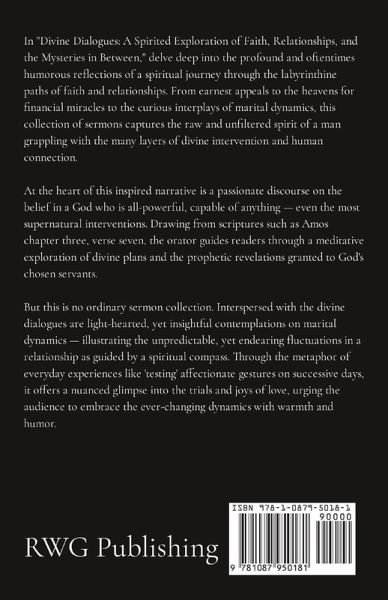 In "Divine Dialogues: A Spirited Exploration of Faith, Relationships, and the Mysteries in Between," delve deep into the profound and oftentimes humorous reflections of a spiritual journey through the labyrinthine paths of faith and relationships. From earnest appeals to the heavens for financial miracles to the curious interplays of marital dynamics, this collection of sermons captures the raw and unfiltered spirit of a man grappling with the many layers of divine intervention and human connection. At the heart of this inspired narrative is a passionate discourse on the belief in a God who is all-powerful, capable of anything - even the most supernatural interventions. Drawing from scriptures such as Amos chapter three, verse seven, the orator guides readers through a meditative exploration of divine plans and the prophetic revelations granted to God's chosen servants. But this is no ordinary sermon collection. Interspersed with the divine dialogues are light-hearted, yet insightful contemplations on marital dynamics - illustrating the unpredictable, yet endearing fluctuations in a relationship as guided by a spiritual compass. Through the metaphor of everyday experiences like 'testing' affectionate gestures on successive days, it offers a nuanced glimpse into the trials and joys of love, urging the audience to embrace the ever-changing dynamics with warmth and humor. As you traverse the path of "Divine Dialogues," be prepared to encounter candid confessions, laughter, and moments of revelation where the earthly meets the divine. It encourages readers to approach life's challenges with a heart full of faith, to find joy in the unpredictable, and to see the hand of God in every moment, whether miraculous or mundane. This book is more than a guide; it is an invitation to embark on a spiritual journey, a pathway to finding joy in the mysteries in between the grand narratives of our lives, grounded firmly in faith and spirited exploration. It reminds us that at the center of the whirlwind of life, relationships, and spiritual challenges, there is a God waiting to help, offering us the keys to understanding and navigating the complex tapestry of human experiences with grace, love, and a touch of divine humor.