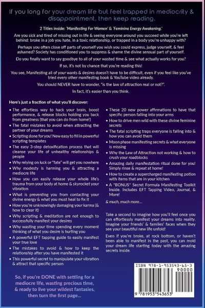 If you long for your dream life but feel trapped in mediocrity & disappointment then keep reading... Are you sick and tired of missing out in life & seeing everyone around you succeed, while you're left behind: broke in a job you hate, in a toxic relationship, or trapped in a body you're unhappy with? Perhaps you often close off parts of yourself you wish you could express, judge yourself, & feel ashamed. Society has conditioned you to suppress & shame the divine sensual part of yourself. Do you finally want to say goodbye to all of your wasted time & see what actually works for you? You see, Manifesting all of your wants & desires doesn't have to be difficult, even if you feel like you've tried every other manifesting book & YouTube video already. Here's just a tiny fraction of what you'll discover!:The ridiculously easy way to hack your brain, boost performance, & release blocks holding you back from greatness (that you can do from home!) The fatal mistakes to avoid when attracting the partner of your dreams Scripting done for you! New easy to fill in powerful scripting templates Why modesty is harming you & attracting a mediocre life How you can easily release your whole life's trauma from your body at home & skyrocket your vibration What is preventing you from contacting your divine energy & what you must heal to fix it How you're unknowingly damaging your karma (& how to clear it) Why wasting your time spending every moment thinking of what you desire is hurting you A powerful EFT tapping guide to easily manifest your true love The mistakes to avoid & how to keep the relationship after you have manifested it This powerful secret to manipulate your vibration & attract that specific person These 20 new power affirmations that will have that specific person falling into your arms How to drive men wild with these divine feminine secrets Amazing daily manifestation ritual done for you! Simply rinse & repeat at home! How to create a supercharged manifesting potion with items that are in your kitchen A treasure-trove of *bonuses*, including a companion video course with over 4.5 hours of empowering content, energy-tapping videos, powerful guided meditations, journals, & so much more. Take a second to imagine how you'll feel once you can effortlessly manifest your dreams into reality. Imagine your friend's faces when they see your beautiful new life unfold! Even if you're broke, at rock bottom, or haven't been able to manifest in the past, you can mold your dream life starting today with the amazing secrets inside. You're holding the key to unlock literally anything you have ever dreamed of in life. It's time to take action! So if you're done with settling for a mediocre life, wasting precious time, & ready to live your wildest fantasies, then turn the first page.