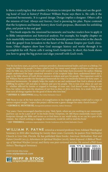 Is there a unifying key that enables Christians to interpret the Bible and see the guiding hand of God in history? Professor William Payne says there is. He calls it the missional hermeneutic. It is a grand design. Design implies a designer. Others call it the mission of God. Always and forever, God is pursuing his plan. Payne contends that the Scriptures and human history show God's purposes, illuminate his unfolding plan, and point to his end goal. This book unpacks the missional hermeneutic and teaches readers how to apply it to Bible interpretation and historical analysis. For example, his lengthy chapter on Acts masterfully uncovers how God and the heavenly powers interacted as the church took the gospel from Jerusalem to the heart of the Roman Empire per God's directions. Other chapters show how God messages history and works through it to accomplish his will. Payne calls it seeing God's footprints. In short, this book shows you how to grasp the big picture and align yourself with God's work.