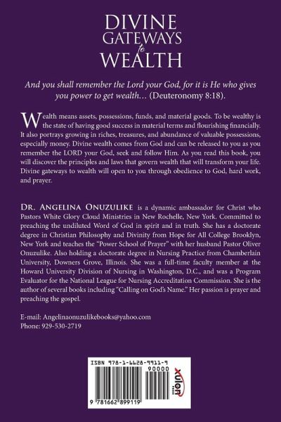 And you shall remember the Lord your God, for it is He who gives you power to get wealth... (Deuteronomy 8:18). Wealth means assets, possessions, funds, and material goods. To be wealthy is the state of having good success in material terms and flourishing financially. It also portrays growing in riches, treasures, and abundance of valuable possessions, especially money. Divine wealth comes from God and can be released to you as you remember the LORD your God, seek and follow Him. As you read this book, you will discover the principles and laws that govern wealth that will transform your life. Divine gateways to wealth will open to you through obedience to God, hard work, and prayer. Dr. Angelina Onuzulike is a dynamic ambassador for Christ who Pastors White Glory Cloud Ministries in New Rochelle, New York. Committed to preaching the undiluted Word of God in spirit and in truth. She has a doctorate degree in Christian Philosophy and Divinity from Hope for All College Brooklyn, New York and teaches the "Power School of Prayer" with her husband Pastor Oliver Onuzulike. Also holding a doctorate degree in Nursing Practice from Chamberlain University, Downers Grove, Illinois. She was a full-time faculty member at the Howard University Division of Nursing in Washington, D.C., and was a Program Evaluator for the National League for Nursing Accreditation Commission. She is the author of several books including "Calling on God's Name." Her passion is prayer and preaching the gospel. E-mail: Angelinaonuzulikebooks@yahoo.com Phone: 929-530-2719