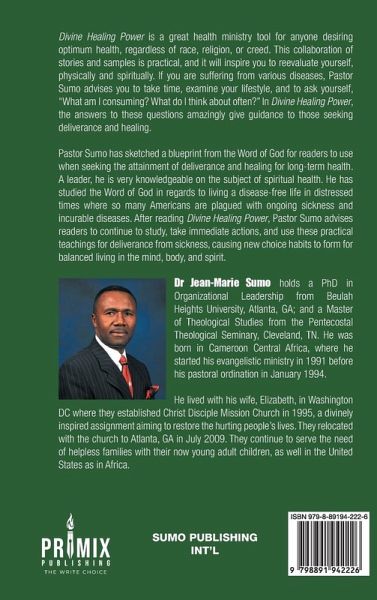 Divine Healing Power is a great health ministry tool for anyone desiring optimum health, regardless of race, religion, or creed. This collaboration of stories and samples is practical, and it will inspire you to reevaluate yourself, physically and spiritually. If you are suffering from various diseases, Pastor Sumo advises you to take time, examine your lifestyle, and to ask yourself, "What am I consuming? What do I think about often?" In Divine Healing Power, the answers to these questions amazingly give guidance to those seeking deliverance and healing. Pastor Sumo has sketched a blueprint from the Word of God for readers to use when seeking the attainment of deliverance and healing for long-term health. A leader, he is very knowledgeable on the subject of spiritual health. He has studied the Word of God in regards to living a disease-free life in distressed times where so many Americans are plagued with ongoing sickness and incurable diseases. After reading Divine Healing Power, Pastor Sumo advises readers to continue to study, take immediate actions, and use these practical teachings for deliverance from sickness, causing new choice habits to form for balanced living in the mind, body, and spirit.