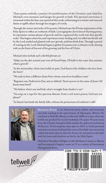 These poems embody a journey of transformation of the Christian soul, fueled by Michael's own metanoia and hunger for growth in faith. His spiritual conversion is witnessed within the four-year period of this work, culminating in a mature and renewed desire to uplift others through the imagery of words. Through the names and order of his poems, Michael uses the Divine inspirations of the Holy Spirit to reflect an evolution of faith. Leveraging the clever lens of rhyming poetry, he represents various phases of growth and has organized this work into that specific order. This begins where his soul experiences inner healing and was tilled into fertile soil by the Lord, seeded and planted with new growth, and bore forth fruit. Through a period of waiting on the Lord, Michael began to gather his poems into a cohesive work, sharing with us the fruits of harvest of his growing zeal for love of Christ. Michael-isms include such colorful phrases as: "Make me the dirt around your tree of Good Hope. I'll hold in the water that sustains other's growth" "In the universality where time holds no part, God knows His children who love from the heart" "We seek to beat a different drum from whose control no headlines come" "Begotten one, Perfection's Son, sent to defend; There's power in the name of Jesus! All knees must bend" "We believe what's not and hide what's wrought from shadow's cart" "No soap on a rope for this specious disease; From a rich man's prison, God save me please!" "In Satan's last battle the family falls without the protections of tradition's walls"