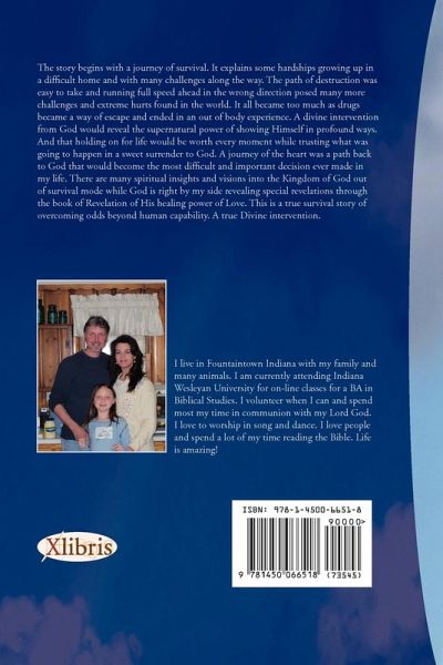 The story begins with a journey of survival. It explains some hardships growing up in a difficult home and with many challenges along the way. The path of destruction was easy to take and running full speed ahead in the wrong direction posed many more challenges and extreme hurts found in the world. It all became too much as drugs became a way of escape and ended in an out of body experience. A divine intervention from God would reveal the supernatural power of showing Himself in profound ways. And that holding on for life would be worth every moment while trusting what was going to happen in a sweet surrender to God. A journey of the heart was a path back to God that would become the most difficult and important decision ever made in my life. There are many spiritual insights and visions into the Kingdom of God out of survival mode while God is right by my side revealing special revelations through the book of Revelation of His healing power of Love. This is a true survival story of overcoming odds beyond human capability. A true Divine intervention.