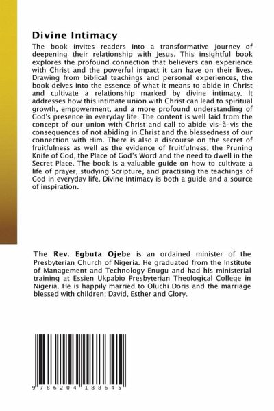 The book invites readers into a transformative journey of deepening their relationship with Jesus. This insightful book explores the profound connection that believers can experience with Christ and the powerful impact it can have on their lives. Drawing from biblical teachings and personal experiences, the book delves into the essence of what it means to abide in Christ and cultivate a relationship marked by divine intimacy. It addresses how this intimate union with Christ can lead to spiritual growth, empowerment, and a more profound understanding of God's presence in everyday life. The content is well laid from the concept of our union with Christ and call to abide vis-à-vis the consequences of not abiding in Christ and the blessedness of our connection with Him. There is also a discourse on the secret of fruitfulness as well as the evidence of fruitfulness, the Pruning Knife of God, the Place of God's Word and the need to dwell in the Secret Place. The book is a valuable guide on how to cultivate a life of prayer, studying Scripture, and practising the teachings of God in everyday life. Divine Intimacy is both a guide and a source of inspiration.