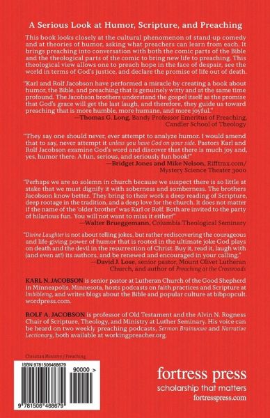 Comedians tend to view the world somewhat askew or askance, and that view--a kind of hermeneutical lens for discerning the comedic in daily life--serves to frame, reframe, and even de-frame reality. Preachers do the same, viewing the world askance through a theological lens of discerning God in daily life. That theological view allows one to preach hope in the face of despair, seeing the world in terms of God's justice and declaring the promise of life out of death. Divine Laughter: Preaching and the Serious Business of Humor looks closely at both the cultural phenomenon of stand-up comedy and theories of humor, asking what preachers can learn from both. Karl N. Jacobson and Rolf A. Jacobson offer preachers a means of growth in their art and an approach to reading Scripture both for its humor and through the lens of humor. The book models approaches to the biblical text that allow the Bible to be funny and that bring humor to the text. Divine Laughter brings the task of preaching into conversation with both the comedic parts of the Bible and the theological parts of the comedic, in order to bring a new kind of life to preaching. As a serious look at humor and laughter in the Bible, the book explores the theological implications of what it means if we think of God, Jesus, and even the Holy Spirit as filled with laughter. Preachers are invited to wonder at and chuckle their way through examples of God's laughter in the Bible, thinking about what that means for God's people, for the life of faith, and for preaching to God's people.