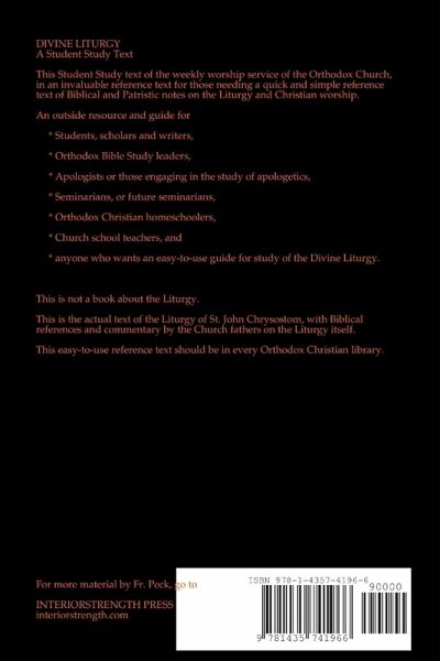 The Divine Liturgy of St. John Chrysostom, with Scripture references and commentary and quotations by the Church Fathers. A terrific text for students, seminarians, church school teachers, busy clergymen or anyone who wants a thorough reference of Orthodox Eucharistic worship. This is not a book about worship. This is the actual liturgical text of the Orthodox Church, with Scriptural and patristic references.