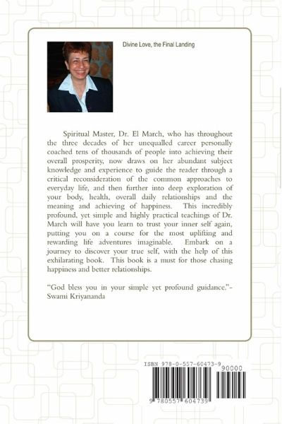 Spiritual Master, Dr. El March, who has throughout the three decades of her unequalled career personally coached tens of thousands of people into achieving their overall prosperity, now draws on her abundant subject knowledge and experience to guide the reader through a critical reconsideration of the common approaches to everyday life, and then further into deep exploration of your body, health, overall daily relationships and the meaning and achieving of happiness. This incredibly profound, yet simple and highly practical teachings of Dr. March will have you learn to trust your inner self again, putting you on a course for the most uplifting and rewarding life adventures imaginable. Embark on a journey to discover your true self, with the help of this exhilarating book. This book is a must for those chasing happiness and better relationships. "God bless you in your simple yet profound guidance."- Swami Kriyananda