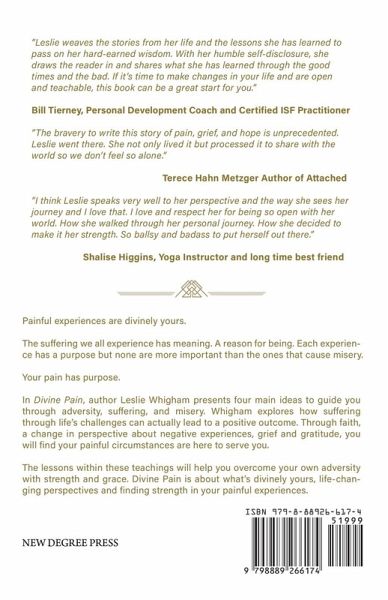 Painful experiences are divinely yours. The suffering we all experience has meaning. A reason for being. Each experience has a purpose but none are more important than the ones that cause misery. Your pain has purpose. In Divine Pain, author Leslie Whigham presents four main ideas to guide you through adversity, suffering, and misery. Whigham explores how suffering through life's challenges can actually lead to a positive outcome. Through faith, a change in perspective about negative experiences, grief and gratitude, you will find your painful circumstances are here to serve you. The lessons within these teachings will help you overcome your own adversity with strength and grace. Divine Pain is about what's divinely yours, life-changing perspectives and finding strength in your painful experiences.