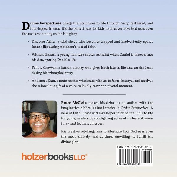 Meet the unlikely animals God uses for glory in this adventurous collection for young readers!In Divine Perspectives, author Bruce McClain highlights real animals from the Bible through creative retellings. He imagines what life was like for these humble creatures behind the scenes of Scripture.Discover Asher, a wild sheep who becomes trapped and inadvertently spares Isaac's life during Abraham's test of faith. Witness Bakari, a young lion who shows restraint when Daniel is thrown into his den, sparing Daniel's life. Follow Chavvah, a barren donkey who gives birth late in life and carries Jesus during his triumphal entry. And meet Eran, a mute rooster who bears witness to Jesus' betrayal and receives the miraculous gift of a voice to loudly crow at a pivotal moment. Divine Perspectives brings the Scriptures to life through furry, feathered, and four-legged friends. It's the perfect way for kids to discover how God uses even the meekest among us for His glory.