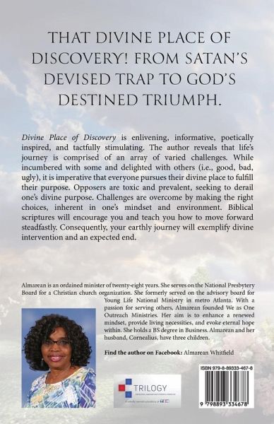 THAT DIVINE PLACE OF DISCOVERY! FROM SATAN'S DEVISED TRAP TO GOD'S DESTINED TRIUMPH. Divine Place of Discovery is enlivening, informative, poetically inspired, and tactfully stimulating. The author reveals that life's journey is comprised of an array of varied challenges. While encumbered with some and delighted with others (i.e., good, bad, ugly), it is imperative that everyone pursues their divined place to fulfill their purpose. Opposers are toxic and prevalent, seeking to derail one's divine purpose. Challenges are overcome by making the right choices, inherent in one's mindset and environment. Biblical scriptures will encourage you and teach you how to move forward steadfastly. Consequently, your earthly journey will exemplify divine intervention and an expected end.
