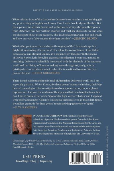 The reach of Divine Ratios is global, ranging from Tang Dynasty China and the Florentine Renaissance to contemporary Baltimore, post-World War II Berlin, and the landscapes of the Mountain West. The speed and mobility evoked in this new collection by Jacqueline Osherow are not only physical--a traveler's movement in a crowded, thrilling world--but imaginative, and its poetic idiom is no less varied, as a breezy conversational tone serves as a counterpoint to traditional form. With striking juxtapositions of natural and cultural wonders, this enrapturing volume asks, what is the right proportion--or "ratio"--for living in a world of such splendors, horrors, and possibilities?