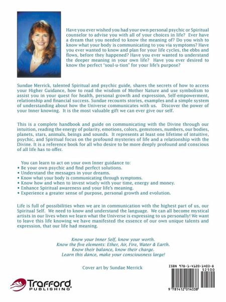 Have you ever wished you had your own personal psychic or Spiritual counselor to advise you with all of your choices in life? Ever have a dream that you needed to know the meaning of? Do you wish to know what your body is communicating to you via symptoms? Have you ever wanted to know and plan for your life cycles, the ebbs and flows, before they happened? Have you ever wanted to understand the deeper meaning in your own life? Have you ever desired to know the perfect "soul-u-tion" for your life's purpose? Sundae Merrick, talented Spiritual and psychic guide, shares the secrets of how to access your Higher Guidance, how to read the wisdom of Mother Nature and use symbolism to assist you in your quest for health, personal growth and expression, Self-empowerment, relationship and financial success. Sundae recounts stories, examples and a simple system of understanding about how the Universe communicates with us. Discover the power of your Inner knowing. It is the most valuable gift we can ever give our self. This is a complete handbook and guide on communicating with the Divine through our intuition, reading the energy of polarity, emotions, colors, gemstones, numbers, our bodies, planets, stars, animals, beings and sounds. It represents at least one lifetime of intuitive, psychic, and Spiritual focus on the profound mysteries of life and a relationship with the Divine. It is a reference book for all who desire to be more deeply profound and conscious of all life has to offer. You can learn to act on your own Inner guidance to: