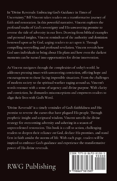 In "Divine Reversals: Embracing God's Guidance in Times of Uncertainty," Bill Vincent takes readers on a transformative journey of faith and restoration. In this powerful narrative, Vincent explores the profound truths of God's sovereignty and His unwavering promise to reverse the tide of adversity in our lives. Drawing from biblical examples and personal insights, Vincent reminds us of the authority and dominion bestowed upon us by God, urging readers to act upon it. Through compelling storytelling and profound revelation, Vincent reveals how God uses individuals to bring about His plans and how even the darkest moments can be turned into opportunities for divine intervention. As Vincent navigates through the complexities of today's world, he addresses pressing issues with unwavering conviction, offering hope and encouragement to those facing impossible situations. From the challenges of modern society to the spiritual warfare raging around us, Vincent's words resonate with a sense of urgency and divine purpose. With clarity and conviction, he dismantles misconceptions and empowers readers to align their lives with God's Word. "Divine Reversals" is a timely reminder of God's faithfulness and His promise to reverse the curses that have plagued His people. Through prophetic insight and scriptural wisdom, Vincent unveils the divine strategy for overcoming adversity and ushering in a season of unprecedented restoration. This book is a call to action, challenging readers to deepen their reliance on God, declare His promises, and stand firm in faith amidst the storms of life. With each page, readers will be inspired to embrace God's guidance and experience the transformative power of His divine reversals.