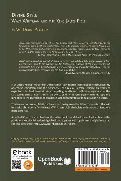 In exploring the seminal works of Walt Whitman, the great American poet, many commentators have acknowledged the underlying influence of The King James Bible.However, a study has yet to elucidate the precise manner in which the Bible has shaped Whitman's poetic style.This is the deficit that F. W. Dobbs-Allsopp seeks to address in his new piece of literary scholarship: 'Divine Style: Walt Whitman and the King James Bible'. Dobbs-Allsopp, Professor of Old Testament at Princeton Theological Seminary, explicitly approaches Whitman from the perspective of a biblical scholar.Utilising his wealth of expertise in this field, he constructs a compelling, erudite and methodical argument for the King James Bible's importance in the evolution of Whitman's style - from his signature long lines to the prevalence of parallelism and tendency towards parataxis in his works.'Divine Style' focuses on Whitman's output in the years preceding the release of his 1855 opus 'Leaves of Grass' through the general period of the book's first three editions. In this, Dobbs-Allsopp's exploration of the period is exhaustive - covering not just Leaves of Grass but recently recovered notebooks, newly digitised manuscripts and additions to the corpus, such as the novel 'Life and Adventures of Jack Engle'.This is a work of careful, detailed scholarship, offering an authoritative commentary that will be a valuable resource for students of Whitman, biblical scholars and scholars of literature more generally.