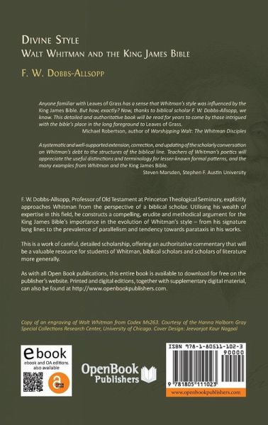 In exploring the seminal works of Walt Whitman, the great American poet, many commentators have acknowledged the underlying influence of The King James Bible.However, a study has yet to elucidate the precise manner in which the Bible has shaped Whitman's poetic style.This is the deficit that F. W. Dobbs-Allsopp seeks to address in his new piece of literary scholarship: 'Divine Style: Walt Whitman and the King James Bible'. Dobbs-Allsopp, Professor of Old Testament at Princeton Theological Seminary, explicitly approaches Whitman from the perspective of a biblical scholar.Utilising his wealth of expertise in this field, he constructs a compelling, erudite and methodical argument for the King James Bible's importance in the evolution of Whitman's style - from his signature long lines to the prevalence of parallelism and tendency towards parataxis in his works.'Divine Style' focuses on Whitman's output in the years preceding the release of his 1855 opus 'Leaves of Grass' through the general period of the book's first three editions. In this, Dobbs-Allsopp's exploration of the period is exhaustive - covering not just Leaves of Grass but recently recovered notebooks, newly digitised manuscripts and additions to the corpus, such as the novel 'Life and Adventures of Jack Engle'.This is a work of careful, detailed scholarship, offering an authoritative commentary that will be a valuable resource for students of Whitman, biblical scholars and scholars of literature more generally.
