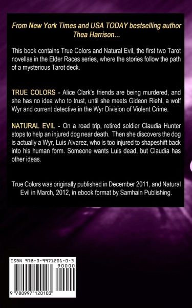 This book contains True Colors and Natural Evil, the first two Tarot novellas in the Elder Races series, where the stories follow the path of a mysterious Tarot deck. Divine Tarot is available in both print and audio formats, whereas the individual novellas are available only in ebook format. True Colors: Alice Clark’s friends are being murdered, and she has no idea who to trust, until she meets Gideon Riehl, a wolf Wyr and current detective in the Wyr Division of Violent Crime. Natural Evil: On a road trip, retired soldier Claudia Hunter stops to help an injured dog near death. Then she discovers the dog is actually a Wyr, Luis Alvarez, who is too injured to shapeshift back into his human form. Someone wants Luis dead, but Claudia has other ideas.