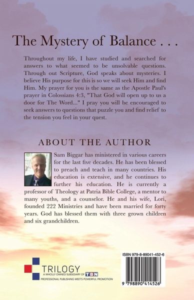 The Mystery of Balance... Throughout my life, I have studied and searched for answers to what seemed to be unsolvable questions. Throughout Scripture, God speaks about mysteries. I believe His purpose for this is so we will seek Him and find Him. My prayer for you is the same as the Apostle Paul's prayer in Colossians 4:3, "That God will open up to us a door for The Word..." I pray you will be encouraged to seek answers to questions that puzzle you and find relief to the tension you feel in your quest.