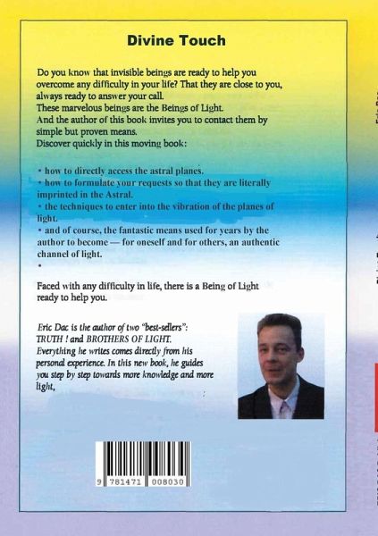 Divine Touch Do you know that invisible beings are ready to help you overcome any difficulty in your life? That they are close to you, always ready to answer your call. These marvelous beings are the Beings of Light. And the author of this book invites you to contact them by simple but proven means. Discover quickly in this moving book: ¿ how to directly access the astral planes. ¿ how to formulate your requests so that they are literally imprinted in the Astral. ¿ the techniques to enter into the vibration of the planes of light. ¿ and of course, the fantastic means used for years by the author to become - for oneself and for others, an authentic channel of light. Faced with any difficulty in life, there is a Being of Light ready to help you. Eric Dac is the author of two "best-sellers": TRUTH ! and BROTHERS OF LIGHT. Everything he writes comes directly from his personal experience. In this new book, he guides you step by step towards more knowledge and more light,