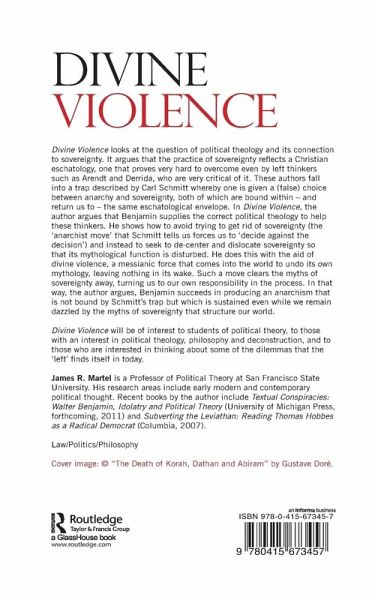 Divine Violence looks at the question of political theology and its connection to sovereignty. It argues that the practice of sovereignty reflects a Christian eschatology, one that proves very hard to overcome even by left thinkers, such as Arendt and Derrida, who are very critical of it. These authors fall into a trap described by Carl Schmitt whereby one is given a (false) choice between anarchy and sovereignty, both of which are bound within--and return us to--the same eschatological envelope. In Divine Violence, the author argues that Benjamin supplies the correct political theology to help these thinkers. He shows how to avoid trying to get rid of sovereignty (the "anarchist move" that Schmitt tells us forces us to "decide against the decision") and instead to seek to de-center and dislocate sovereignty so that it's mythological function is disturbed. He does this with the aid of divine violence, a messianic force that comes into the world to undo its own mythology, leaving nothing in its wake. Such a move clears the myths of sovereignty away, turning us to our own responsibility in the process. In that way, the author argues,Benjamin succeeds in producing an anarchism that is not bound by Schmitt's trap but which is sustained even while we remain dazzled by the myths of sovereignty that structure our world. Divine Violence will be of interest to students of political theory, to those with an interest in political theology, philosophy and deconstruction, and to those who are interested in thinking about some of the dilemmas that the 'left' finds itself in today.