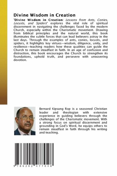 "Divine Wisdom in Creation: Lessons from Ants, Conies, Locusts, and Spiders" explores the vital role of spiritual discernment in navigating the challenges faced by the modern Church, especially within the Charismatic movement. Drawing from biblical principles and the natural world, this book illuminates the subtle forces that can lead believers astray in the last days. Through the examples of ants, conies, locusts, and spiders, it highlights key virtues-wisdom, diligence, unity, and resilience-teaching readers how these qualities can guide the Church to remain steadfast in faith. In an age of confusion and distraction, this book encourages the Church to strengthen its foundations, uphold truth, and persevere with unwavering devotion.