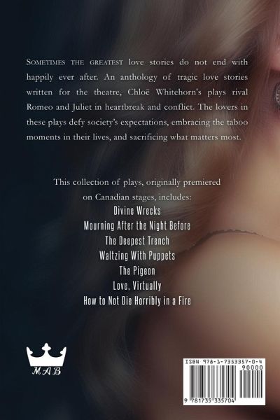 Sometimes the greatest love stories do not end with happily ever after. An anthology of tragic love stories written for the theatre, Chloë Whitehorn's plays rival Romeo and Juliet in heartbreak and conflict. The lovers in these plays defy society's expectations, embracing the taboo moments in their lives, and sacrificing what matters most. This collection of plays, originally premiered on Canadian stages, includes: Divine Wrecks Full length drama, 3F 3M There are many different types of love: first love, true love, obsessive love, and that other type of love. A high school god falls for the wrong girl. His teacher. A modern take on a classic story, this dark tale of heart break and revelations explores the nature of love without boundaries. Mourning After the Night Before Full length drama, 3F 2M When a family moves to a small coastal town to recover from a tragedy, they struggle to rediscover who they are and if they're worth saving. Lucy doesn't know who she is anymore. Everett is falling in love. Drew has lost so much already. Fenwick is just trying to keep her family afloat. And Pippa, well Pippa is drowning. Mourning After the Night Before explores the rippling impact of loss and the repercussions of drowning in every way a person can drown. The Deepest Trench One-act comedic drama, 2F 1M An almost love story about the ways we protect the people we love, trench warfare as a version of a fairy tale ending, and a pair of ducks. Waltzing With Puppets One-act drama, 1F 1M When searching for the man of your dreams, why would you marry someone who reminded you of the man in your nightmares? The Pigeon Full length drama, 2F 1M What could Jegger, a young punk, and Malone, a past middle-aged woman, possibly have in common? Drawn together by their mutual hatred for the woman who damaged them both, they plot her destruction. Some say revenge is bittersweet, and sometimes it's like a box of chocolates. *Listed as one of the 10 Best Toronto Productions of the year it premiered Love, Virtually Full length dramatic comedy, 3F 4M A play about our storybook romance expectations and how real life struggles to live up to the fantasy lives we've created for ourselves. It's like Shrodinger's cat. As long as you stick to online dating without really getting to know someone, you're perfect together without actually being in a relationship. *Toronto Best of Fringe How to Not Die Horribly in a Fire Monologue, 1F Claire has just been proposed to. As she considers her response she reflects on advice her mother gave her in an ice cream shop, her gold star rating system for men, and how likely she is to die in a fire. Trigger warnings: suicide, mental illness, rape, murder.
