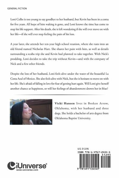 Loni Colbe is too young to say goodbye to her husband, but Kevin has been in a coma for five years. All hope of him waking is gone, and Loni knows the time has come to stop his life support. After his death, she is left wondering if she will ever move on with her life-if she will ever stop feeling the pain of his loss. A year later, she attends her ten-year high school reunion, where she runs into an old friend named Nicholas Hart. She shares her pain with him, as well as details surrounding a scuba trip she and Kevin had planned to take together. With Nick's prodding, Loni decides to take the trip without Kevin-and with the company of Nick and a few other friends. Despite the loss of her husband, Loni feels alive under the water of the beautiful La Costa Azul of Mexico. She also feels alive with Nick, but she is hesitant to move on with her life. She's afraid of falling in love for fear of getting hurt again. Will Loni give herself another chance at happiness, or will her feelings of abandonment drown her in blue?