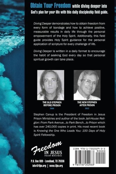 Obtain your freedom while diving deeper into God's plan for your life with this daily discipleship field guide. Diving Deeper demonstrates how to obtain freedom from every form of bondage and how to achieve positive, measureable results in daily life through the personal empowerment of the Holy Spirit. Additionally, this field guide provides Holy Spirit guidance for the personal application of scripture for every challenge of life. Diving Deeper is written in a daily format to encourage the habit of seeking God every day so that personal spiritual growth can take place. In Matthew 28:18, the last command Jesus gave His followers was to "go and make disciples". A "disciple" is a "disciplined learner". Someone who is a "church member" is not necessarily a "disciple". This discipleship field guide is for anyone who wants to be a "disciplined learner" by growing in knowledge of the Scriptures, and being led by the Holy Spirit to apply the Word to every life situation. Jesus came to restore us to relationship with our Heavenly Father. The Holy Spirit is our Teacher, Counselor, Friend, Helper and Guide. Committing a block of time daily with Him is a key to growing in relationship to our Father. This book helps the believer establish the discipline of spending time daily in the Word, and with the Holy Spirit. Seeking God earnestly every day results in personal spiritual growth and rewards (Hebrews 11:6). "I was bound in prisons of my own making - addictions, pride, depression, anger, bi-polar illness, un-forgiveness, shame, regret, etc. - long before I was incarcerated behind the steel bars and razor wire of a penal institution. The Truth I found in Jesus and His Word by His Holy Spirit set me free long before I was released to the free world. God did it for me; He will for you." Stephen Canup