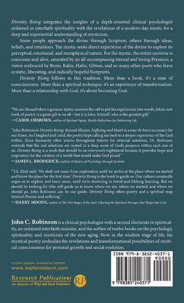 Divinity Rising integrates the insights of a depth-oriented clinical psychologist ordained in interfaith spirituality with the revelations of a modern-day mystic for a deep and experiential understanding of mysticism. Some people approach the divine through Scripture, others through ideas, beliefs, and intuitions. The mystic seeks direct experience of the divine to explore its perceptual, emotional, and metaphysical nature. For the mystic, the entire universe is conscious and alive, saturated by an all-encompassing eternal and loving Presence, a vision embraced by Rumi, Kabir, Hafez, Gibran, and so many other poets who leave ecstatic, liberating, and radically hopeful footprints. Divinity Rising follows in this tradition. More than a book, it's a state of consciousness. More than a spiritual technique, it's an experience of transformation. More than a relationship with God, it's about becoming God.