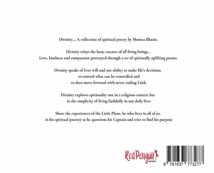 Divinity.... A collection of spiritual poetry by Monica Bhasin. Divinity relays the basic essence of all living beings... Love, kindness and compassion portrayed through a set of spiritually uplifting poems. Divinity speaks of Free will and our ability to make life's decisions, to control what can be controlled and to then move forward with never ending Faith. Divinity explores spirituality not in a religious context but in the simplicity of living faithfully in our daily lives Share the experiences of the Little Plane, he who lives in all of us, in his spiritual journey as he questions his Captain and tries to find his purpose