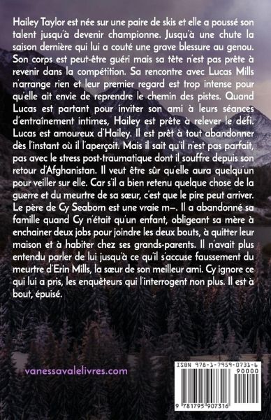 Hailey Taylor est née sur une paire de skis et elle a poussé son talent jusqu'à devenir championne. La meilleure de sa catégorie. Jusqu'à une chute la saison dernière qui lui a couté une grave blessure au genou. Son corps est peut-être guéri mais sa tête n'est pas prête à revenir dans la compétition. Sa rencontre avec Lucas Mills n'arrange rien et leur premier regard est trop intense pour qu'elle ait envie de reprendre le chemin des pistes. Quand Lucas est partant pour inviter son ami à leurs séances d'entraînement intimes, Hailey est prête à relever le défi. Lucas est amoureux d'Hailey. Il est prêt à tout abandonner dès l'instant où il l'aperçoit. Mais il sait qu'il n'est pas parfait, pas avec le stress post-traumatique dont il souffre depuis son retour d'Afghanistan. Il veut être sûr qu'elle aura quelqu'un pour veiller sur elle. Car s'il a bien retenu quelque chose de la guerre et du meurtre de sa s¿ur, c'est que le pire peut arriver. Le père de Cy Seaborn est une vraie m-. Il a abandonné sa famille quand Cy n'était qu'un enfant, obligeant sa mère à enchainer deux jobs pour joindre les deux bouts, à quitter leur maison et à habiter chez ses grands-parents. Il n'avait plus entendu parler de lui jusqu'à ce qu'il s'accuse faussement du meurtre d'Erin Mills, la s¿ur de son meilleur ami. Cy ignore ce qui lui a pris, les enquêteurs qui l'interrogent non plus. Il est à bout, épuisé. Tous les trois sont marqués, à l'intérieur comme à l'extérieur. Lucas est prêt à tout, mais il pense qu'il ne suffira pas. Cy ne mérite pas une fille comme Hailey, marqué par les mauvais choix de son père. Quant à Hailey ? Son seul engagement aura été pour son sport, ce qui ne lui aura causé que solitude et blessure. Et s'ils la laissaient tomber ? Son c¿ur s'en remettrait-il ? Et surtout... avec un meurtrier en cavale à Cutthroat, survivront-ils ?