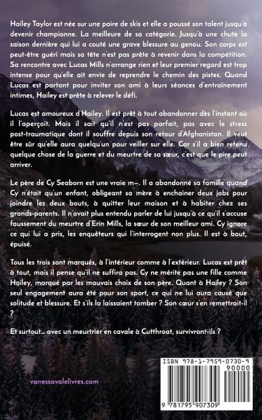 Hailey Taylor est née sur une paire de skis et elle a poussé son talent jusqu'à devenir championne. La meilleure de sa catégorie. Jusqu'à une chute la saison dernière qui lui a couté une grave blessure au genou. Son corps est peut-être guéri mais sa tête n'est pas prête à revenir dans la compétition. Sa rencontre avec Lucas Mills n'arrange rien et leur premier regard est trop intense pour qu'elle ait envie de reprendre le chemin des pistes. Quand Lucas est partant pour inviter son ami à leurs séances d'entraînement intimes, Hailey est prête à relever le défi. Lucas est amoureux d'Hailey. Il est prêt à tout abandonner dès l'instant où il l'aperçoit. Mais il sait qu'il n'est pas parfait, pas avec le stress post-traumatique dont il souffre depuis son retour d'Afghanistan. Il veut être sûr qu'elle aura quelqu'un pour veiller sur elle. Car s'il a bien retenu quelque chose de la guerre et du meurtre de sa s¿ur, c'est que le pire peut arriver. Le père de Cy Seaborn est une vraie m-. Il a abandonné sa famille quand Cy n'était qu'un enfant, obligeant sa mère à enchainer deux jobs pour joindre les deux bouts, à quitter leur maison et à habiter chez ses grands-parents. Il n'avait plus entendu parler de lui jusqu'à ce qu'il s'accuse faussement du meurtre d'Erin Mills, la s¿ur de son meilleur ami. Cy ignore ce qui lui a pris, les enquêteurs qui l'interrogent non plus. Il est à bout, épuisé. Tous les trois sont marqués, à l'intérieur comme à l'extérieur. Lucas est prêt à tout, mais il pense qu'il ne suffira pas. Cy ne mérite pas une fille comme Hailey, marqué par les mauvais choix de son père. Quant à Hailey ? Son seul engagement aura été pour son sport, ce qui ne lui aura causé que solitude et blessure. Et s'ils la laissaient tomber ? Son c¿ur s'en remettrait-il ? Et surtout... avec un meurtrier en cavale à Cutthroat, survivront-ils ?