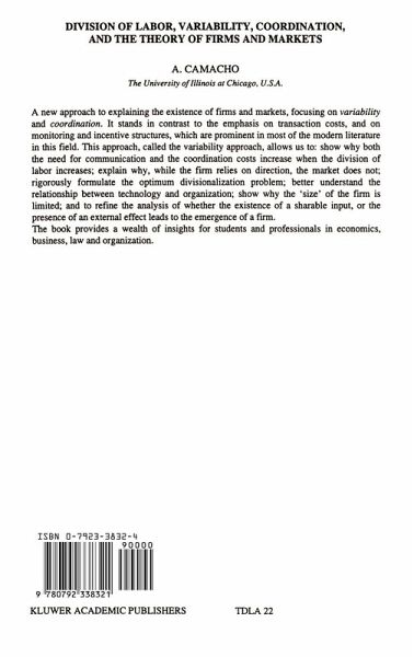 A new approach to explaining the existence of firms and markets, focusing on variability and coordination . It stands in contrast to the emphasis on transaction costs, and on monitoring and incentive structures, which are prominent in most of the modern literature in this field. This approach, called the variability approach, allows us to: show why both the need for communication and the coordination costs increase when the division of labor increases; explain why, while the firm relies on direction, the market does not; rigorously formulate the optimum divisionalization problem; better…mehr