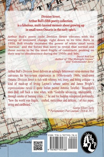 Division Street is a complex, multifaceted, memoiresk, collection of poems about growing up in small town Ontario in the early 1960’s. This is Arthur Bull’s fifth collection of poetry. It brings together a historical, cultural, political and personal perspective of a 12-year-old, looking out on his worlds from the shore of Lake Ontario. Drawing together popular culture, current events, historical reflections with personal narrative, it features appearances by Godzilla, Poe, Diefenbaker and Mister Ed, among many others. Arthur Bull’s world is balanced on the edge of the maelstrom of the 60’s seen through the eyes of someone on the verge of becoming a teenager.