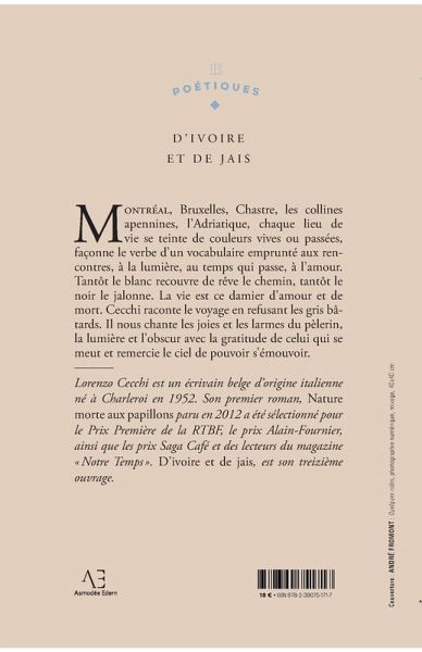 Montréal, Bruxelles, Chastre, les collines apennines, l'Adriatique, chaque lieu de vie se teinte de couleurs vives ou passées, façonne le verbe d'un vocabulaire emprunté aux rencontres, à la lumière, au temps qui passe, à l'amour. Tantôt le blanc recouvre de rêve le chemin, tantôt le noir le jalonne. La vie est ce damier d'amour et de mort. Cecchi raconte le voyage en refusant les gris bâtards. Il nous chante les joies et les larmes du pèlerin, la lumière et l'obscur avec la gratitude de celui qui se meut et remercie le ciel de pouvoir s'émouvoir. Lorenzo Cecchi est un écrivain belge d'origine italienne né à Charleroi en 1952. Son premier roman, Nature morte aux papillons paru en 2012 a été sélectionné pour le Prix Première de la RTBF, le prix Alain-Fournier, ainsi que les prix Saga Café et des lecteurs du magazine ' Notre Temps '. D'ivoire et de jais, est son treizième ouvrage.