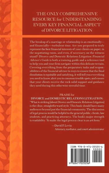 THE ONLY COMPREHENSIVE RESOURCE for UNDERSTANDING EVERY KEY FINANCIAL ASPECT of DIVORCE LITIGATION The breakup of a marriage or relationship is an emotionally-- and financially-- turbulent time. Are you prepared to truly represent the best financial interests of your clients on paper, in the negotiating room, and even, if necessary, on the witness stand? Divorce and Domestic Relations Litigation: Financial Adviser's Guide is both a training guide and a reference tool to help you and your firm navigate within this delicate terrain. Covering everything from the preparatory tasks and responsibilities of the financial adviser to ways to ensure that the final dissolution is equitable and satisfying, it will tell you everything you need to know, alert you to common trouble spots, and ensure that your clients receive the rock-solid support and guidance they need during this otherwise stressful time. Praise for Divorce and Domestic Relations Litigation: "What is striking [about Divorce and Domestic Relations Litigation] is the clear, straightforward style. This book should have many audiences beyond just the financial community. The discussion of legal process would be helpful to the general public, clients, law students, and practicing attorneys. The book's major strength is readability. To make the legal process clear is an art form." -- David P. Levin Attorney, mediator, and court administrator