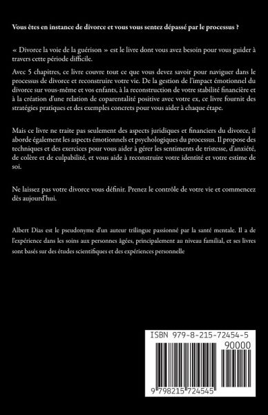 Vous êtes en instance de divorce et vous vous sentez dépassé par le processus ? Vous avez du mal à gérer les aspects juridiques et financiers de la séparation ? « Divorce la voie de la guérison » est le livre dont vous avez besoin pour vous guider à travers cette période difficile. Avec 5 chapitres, ce livre couvre tout ce que vous devez savoir pour naviguer dans le processus de divorce et reconstruire votre vie. De la gestion de l'impact émotionnel du divorce sur vous-même et vos enfants, à la reconstruction de votre stabilité financière et à la création d'une relation de coparentalité positive avec votre ex, ce livre fournit des stratégies pratiques et des exemples concrets pour vous aider à chaque étape. Mais ce livre ne traite pas seulement des aspects juridiques et financiers du divorce, il aborde également les aspects émotionnels et psychologiques du processus. Il propose des techniques et des exercices pour vous aider à gérer les sentiments de tristesse, d'anxiété, de colère et de culpabilité, et vous aide à reconstruire votre identité et votre estime de soi. Ne laissez pas votre divorce vous définir. Prenez le contrôle de votre vie et commencez dès aujourd'hui le chemin de la guérison avec « Divorce la voie de la guérison». Que vous recherchiez des conseils, de l'inspiration ou des conseils pratiques, ce livre est votre guide ultime pour traverser cette période difficile et en sortir plus fort de l'autre côté. Acheter maintenant. Albert Dias est le pseudonyme d'un auteur trilingue passionné par la santé mentale. Il a de l'expérience dans les soins aux personnes âgées, principalement au niveau familial, et ses livres sont basés sur des études scientifiques et des expériences personnelles. Sa mère a reçu un diagnostic d'Alzheimer alors qu'il avait une vingtaine d'années et son père est décédé quelques années plus tôt d'un cancer. À la suite de ces événements, Abert Dias a compris que le stress fait partie de la vie et peut être mieux géré en apprenant comment il l'affecte physiquement et mentalement. C'est aussi un grand voyageur qui aime passer du temps avec ses amis et lire.
