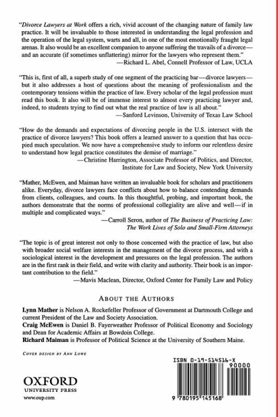 How do lawyers think about and make the important decisions that constitute the day-to-day practice of law? This book explores that question through an extensive empirical study of lawyers practicing divorce law in New England. The authors emphasize the importance of "collegial control" in shaping lawyers' decisions and identify a variety of "communities of practice" that serve as key agents of that control. Offering a new understanding of the nature of lawyers' work in divorce law as well as a new perspective on legal professionalism, this book is required reading for scholars, students, and practitioners.